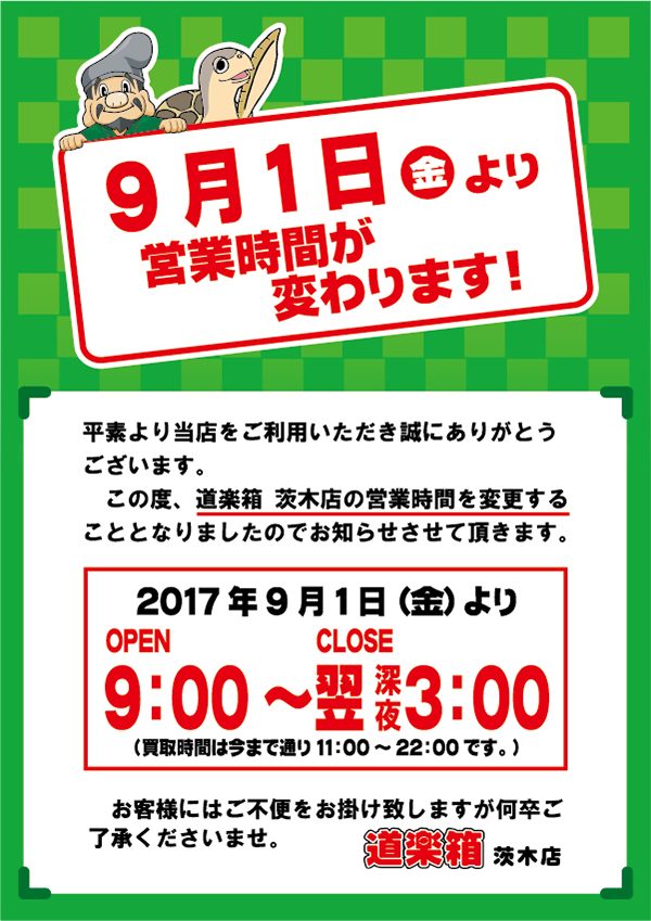 茨木店 9月1日(金)より営業時間変更のお知らせ
