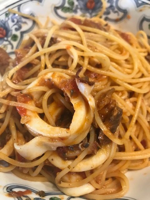 剣先イカとサバ缶のトマトソーススパゲティ ニンニク風味