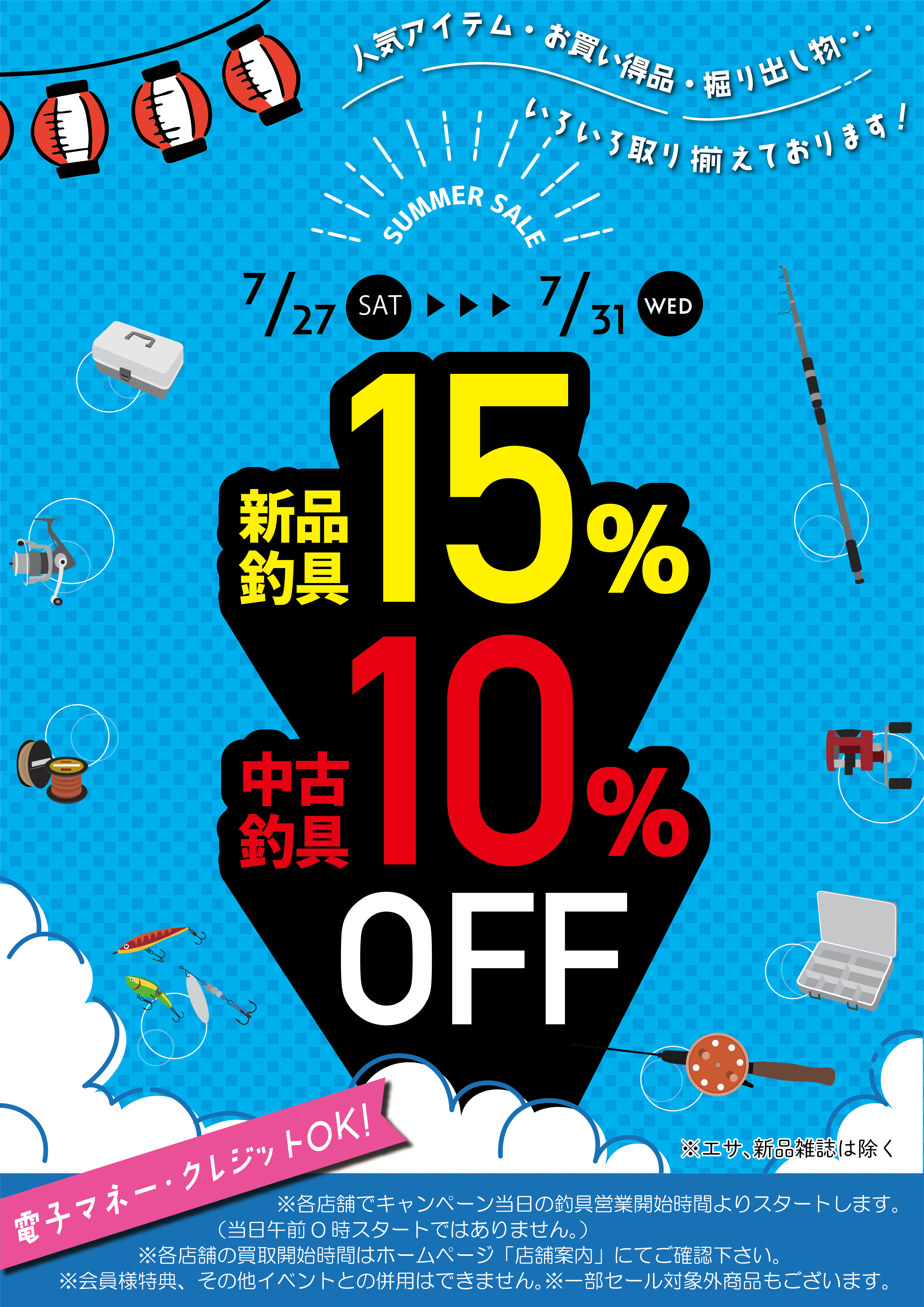 7月27日(土)から新品釣具15%OFF、中古釣具10%OFFセール!!!
