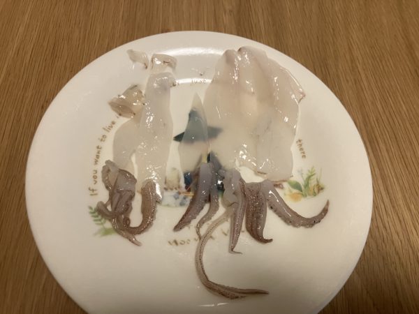 前回の釣果を藤田さんに丸々譲っていただき、刺身でいただきました!スーパーのイカとは比べ物にならないほど美味しくて、今回の釣果を捌くのも楽しみです!藤田さんありがとうございます!