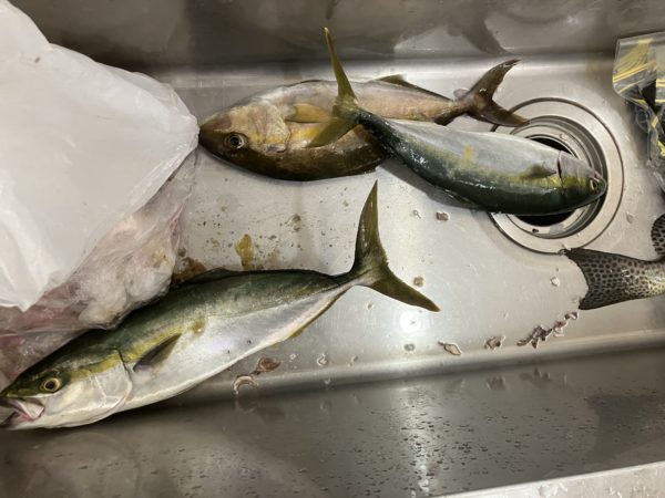 最終的に青物は4本釣り上げられました!ハマチが40cmが一本、50前後が二本、40ほどのシオが一本という釣果でした!写真では黄色いスジがはいっていますが、死んだあとに入ったもので平政ではありませんでした。