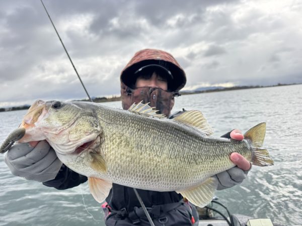 移動して一投目に山崎プロのHP3Dワッキーのネコリグで30cm程のバスがヒット!