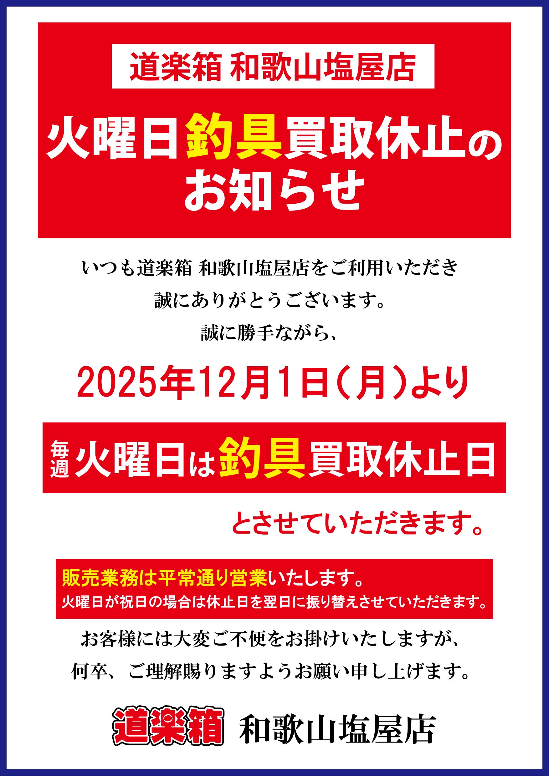 道楽箱 和歌山塩屋店 12月1日(月)より火曜日「釣具」買取休止のお知らせ