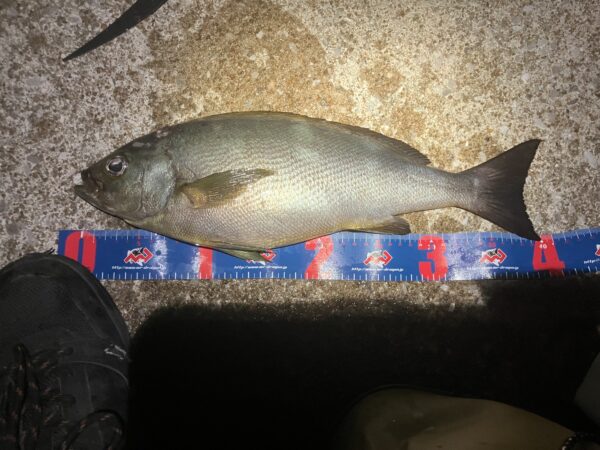 初日夜は雨上がりの活性に期待してサバの切り身でぶっこみ釣りをしました!途中でバラシもあったものの40cm近い伊佐木を釣り上げて満足な釣果となりました。